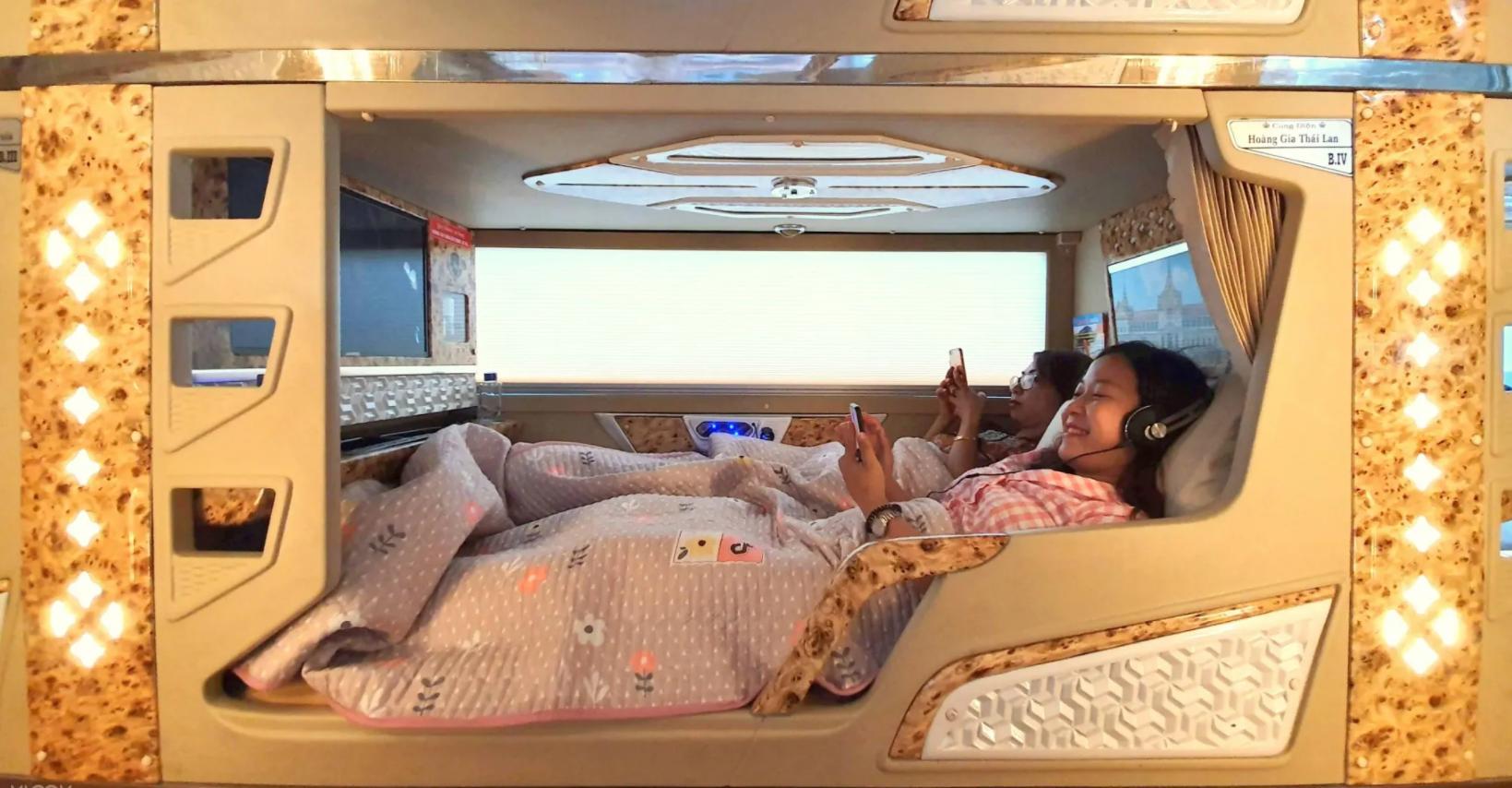 1. Thoải mái và riêng tư: Mỗi giường đôi đều được bọc da cao cấp, êm ái, rộng rãi, đảm bảo bạn sẽ cảm thấy như đang ở trong một phòng nghỉ mini di động. Không gian riêng tư với rèm che kín đáo cho phép bạn thư giãn thoải mái cùng người đồng hành.